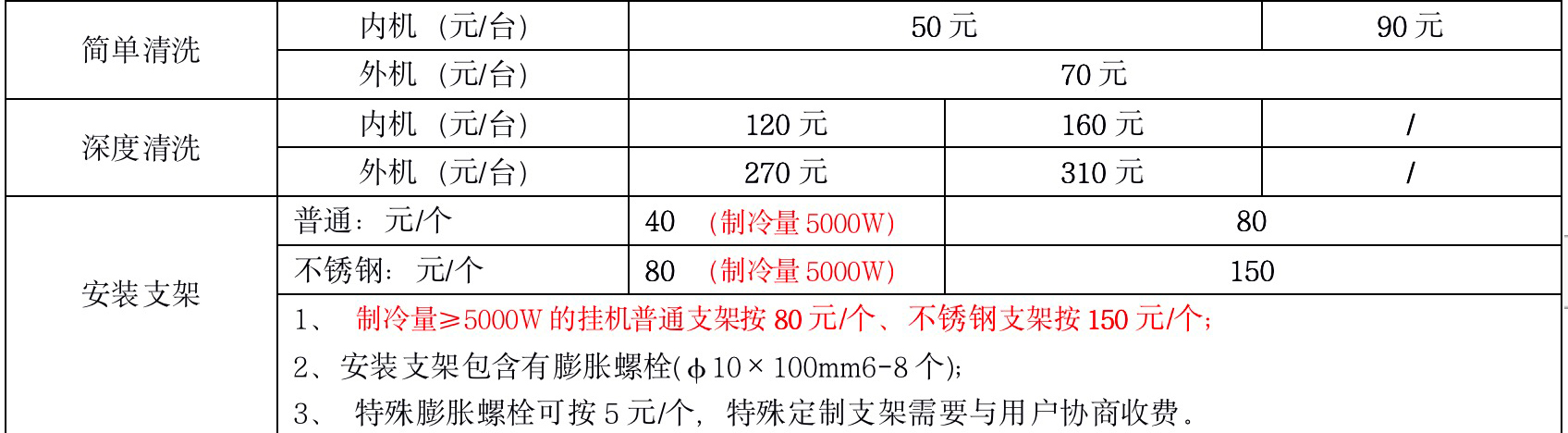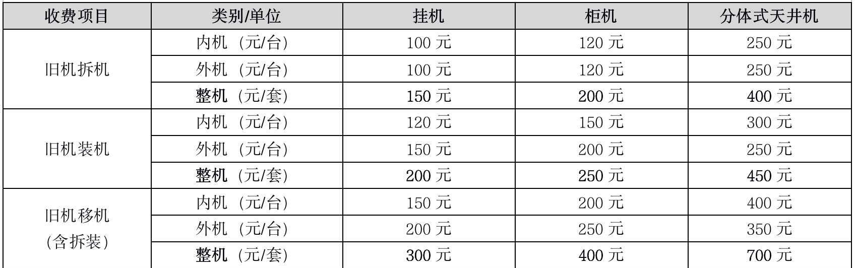 1、拆、装、移机均不含运输、维修、拆装防盗网、材料等费用,但已包含补加冷媒及人工费用;非格力服务商拆机、移机,格力服务商二次服务时需收取加冷媒费用;若环境特殊需另外联系吊车或搭建脚手架等特种安装设备,由服务人员协助用户与第三方协商收费解决。