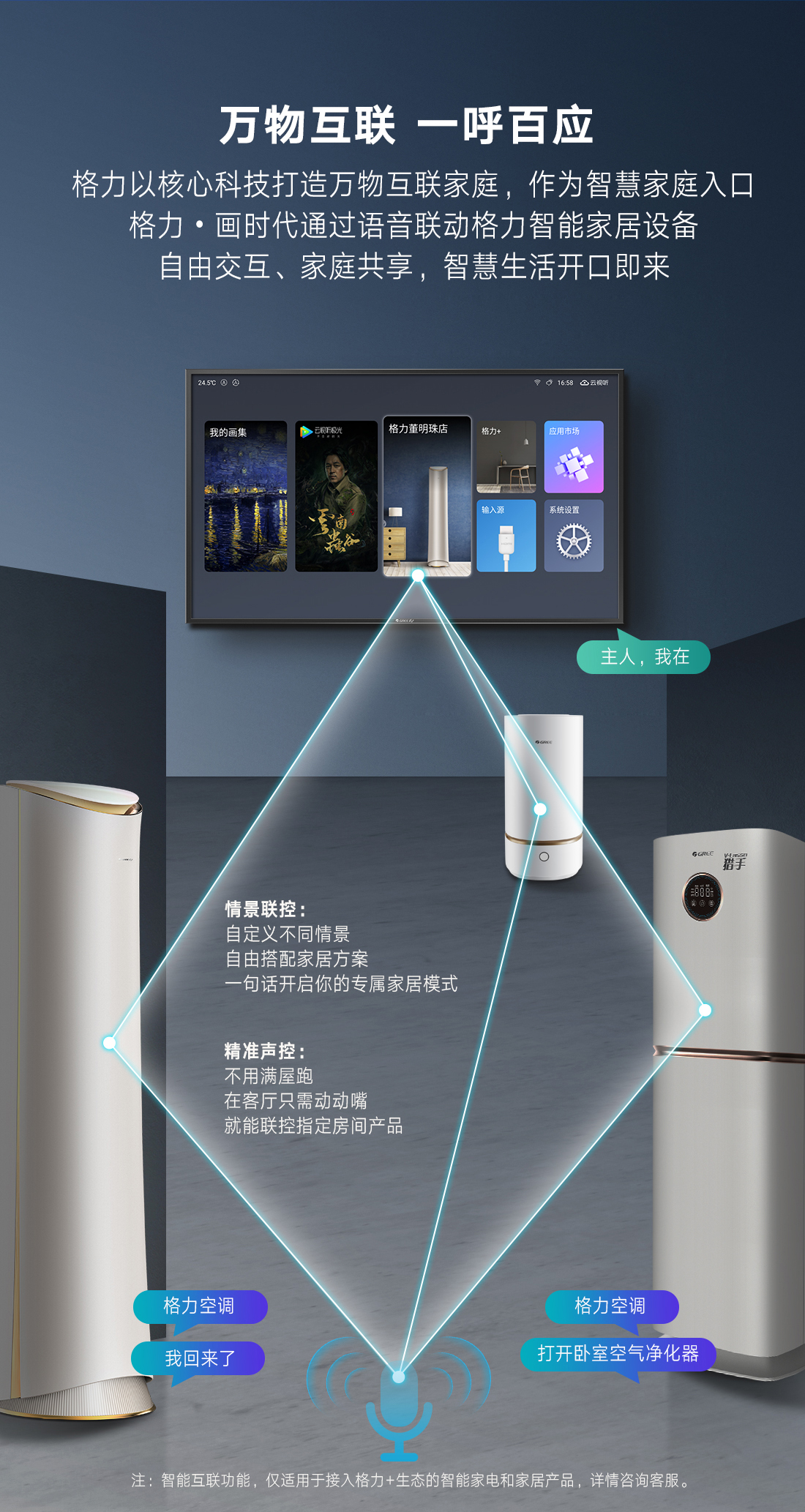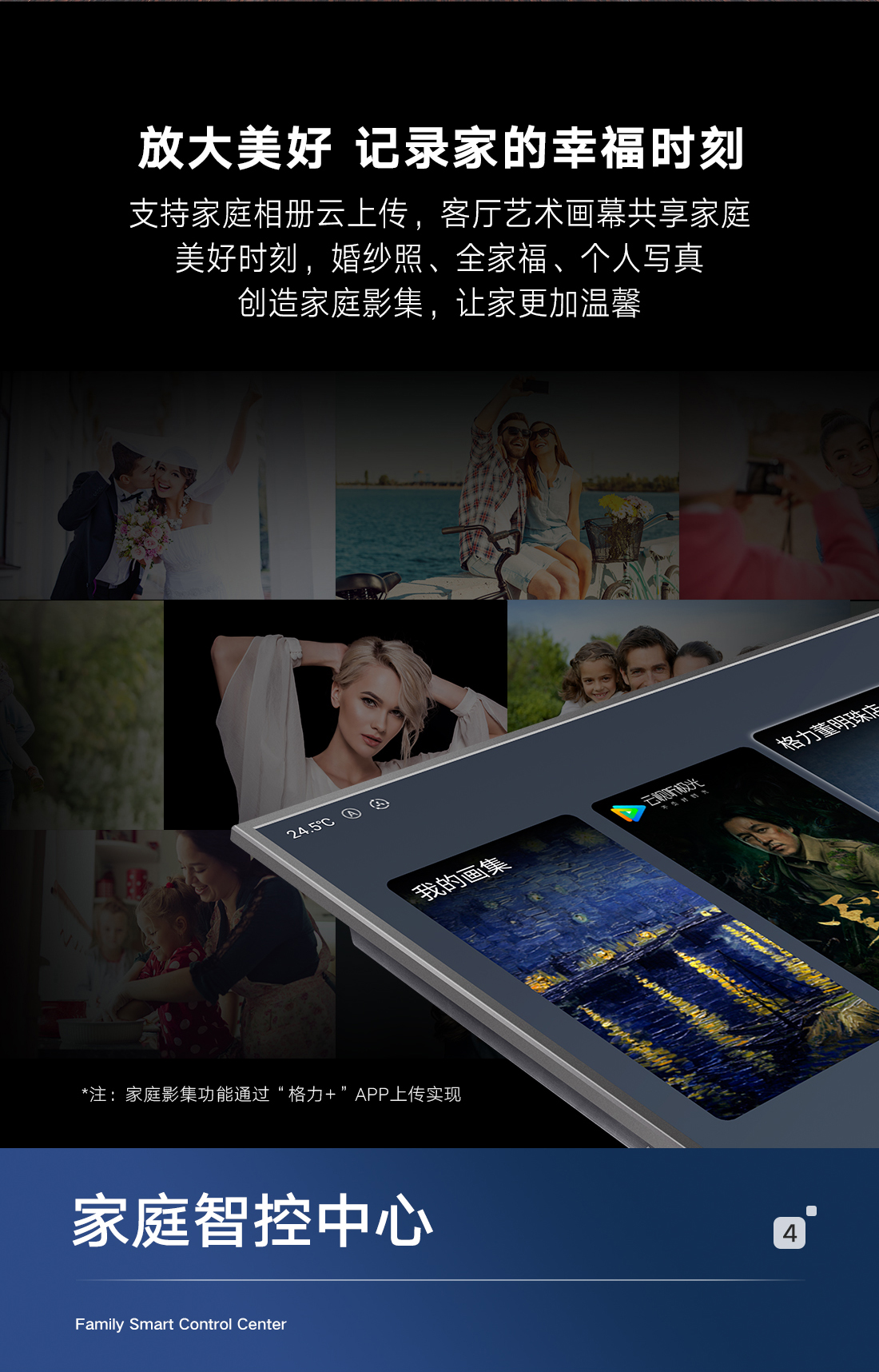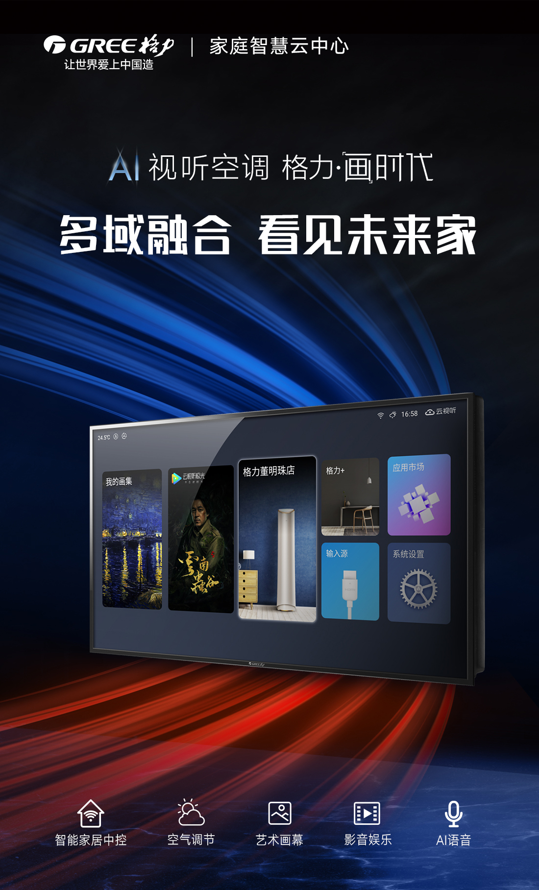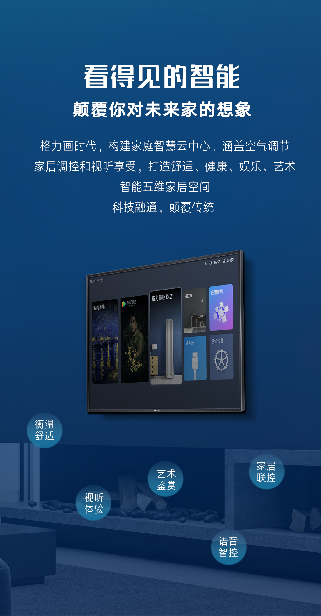 科技融通,颠覆传统。格力·画时代,构建家庭智慧云中心,集成空气调节、艺术画幕、影音娱乐、智能中控四大中心功能,新时代的智慧家庭新物种,跃见“未来家”。