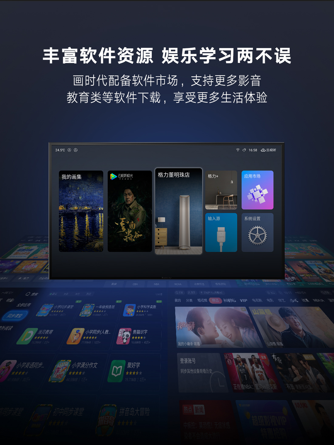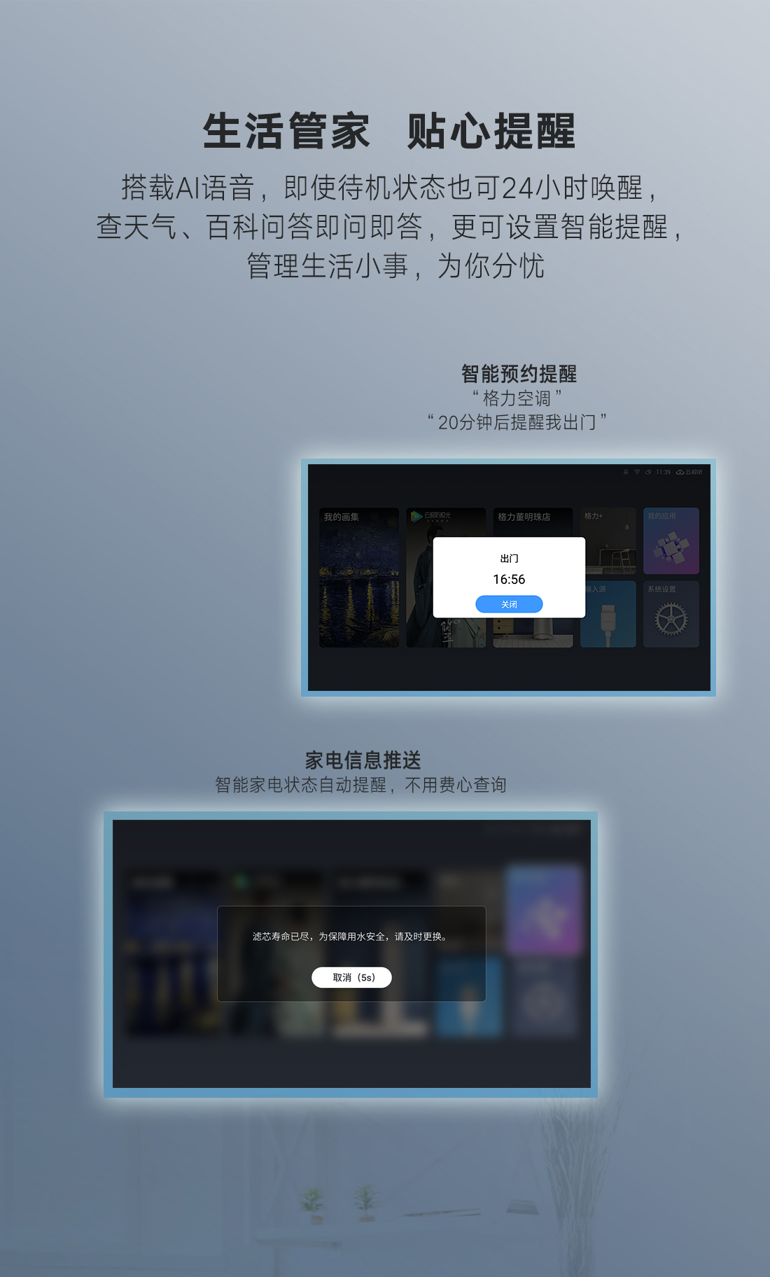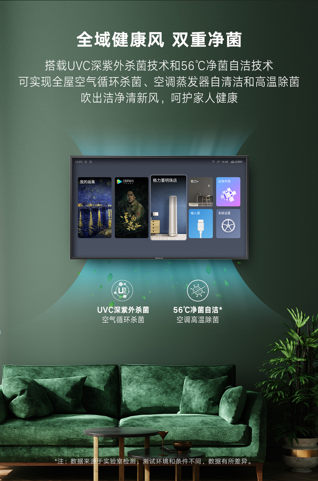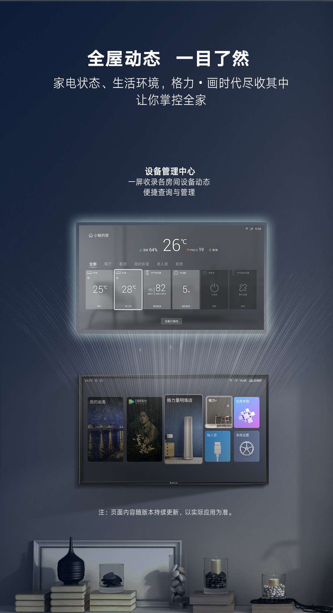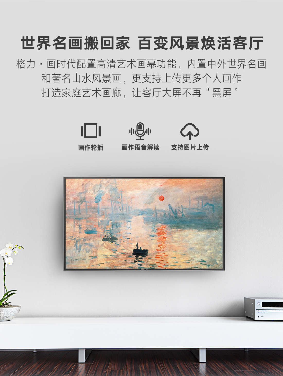 科技融通,颠覆传统。格力·画时代,构建家庭智慧云中心,集成空气调节、艺术画幕、影音娱乐、智能中控四大中心功能,新时代的智慧家庭新物种,跃见“未来家”。